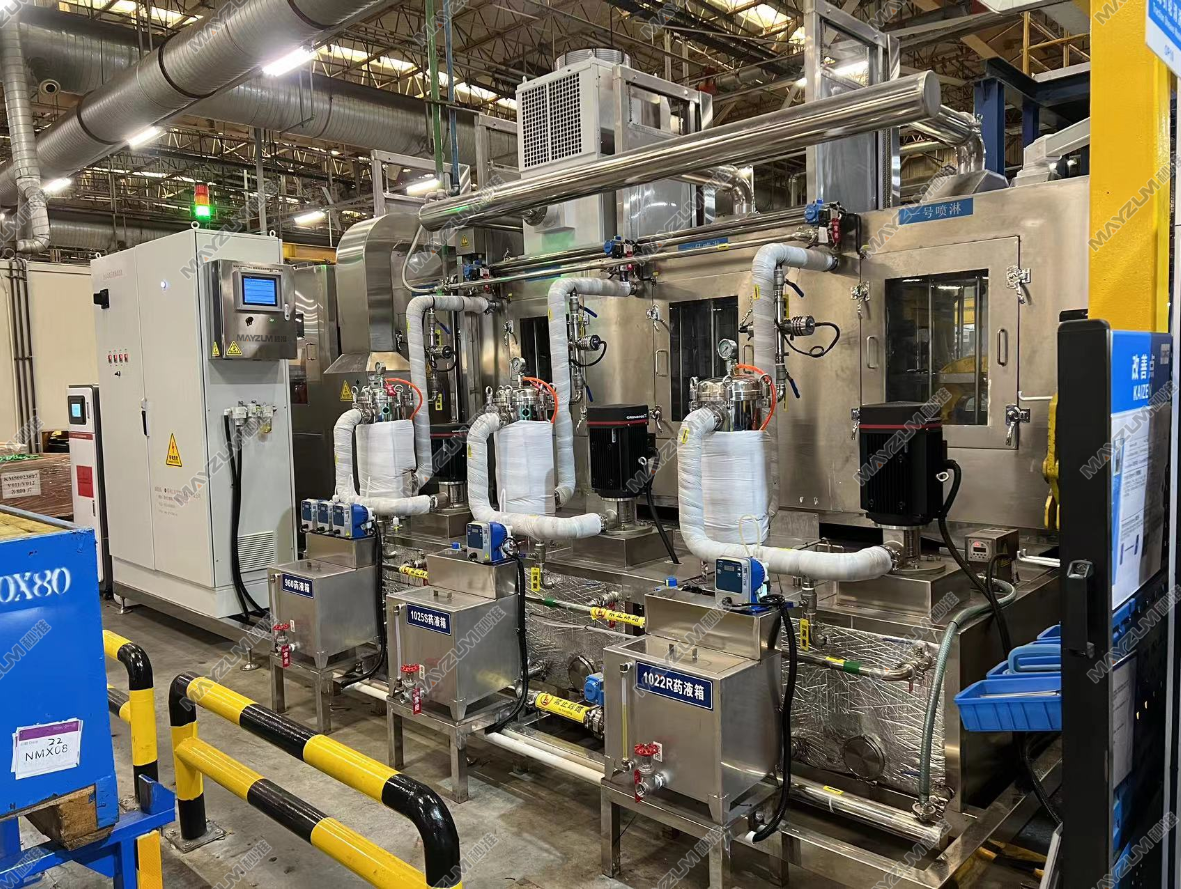 秒準(zhǔn) MAYZUM 一拖多在線清洗劑濃度測控系統(tǒng)創(chuàng)造性滿足多清洗槽同步監(jiān)控需求,集成濃度、PH、電導(dǎo)率、溫度監(jiān)測及自動配液等功能,顯著降低設(shè)備投入成本。系統(tǒng)與企業(yè) MES 系統(tǒng)互聯(lián),實現(xiàn)清洗過程數(shù)據(jù)自動采集與報表生成,提升生產(chǎn)管理效率。